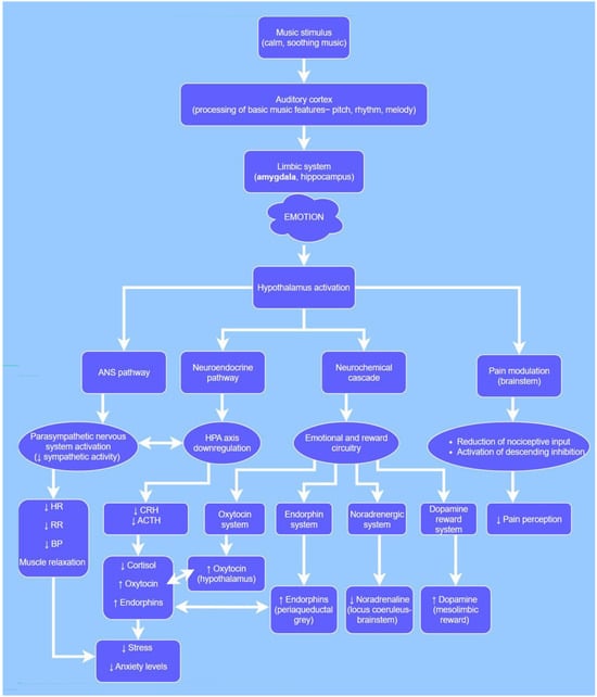 The effects of music on autonomic regulation are often associated with decreased pain perception and a reduced stress response and are commonly accompanied by lower levels of cortisol, a hormone related to stress [15,73,74,75], and an increase in oxytocin levels [65,73,76]. Oxytocin has notable anti-stress and anti-anxiety properties and may enhance vagal activity by suppressing sympathetic nervous system (SNS) responses and hypothalamic–pituitary–adrenal (HPA) axis activation during stress, suggesting that higher oxytocin levels promote relaxation through vagal nerve stimulation [73,76]. Brain regions involved in stress response, namely, the prefrontal cortex, amygdala and hippocampus, are also involved in pain processing [77]. These, in turn, are closely connected to the hypothalamus and thereby influence the HPA axis and the SNS by transmitting signals to the adrenal glands [78].