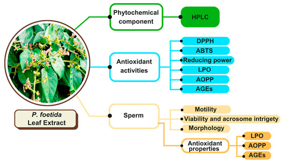 Overview of the experimental research outline. P. foetida leaf extract was analyzed for phytochemical content (HPLC) and antioxidant activity (DPPH, ABTS, reducing power, LPO, AOPP, and AGEs). Extracts were applied to frozen–thawed sperm (0.1375–2.20 mg/mL), and sperm quality and antioxidant properties in the supernatant (LPO, AOPP, and AGEs) were assessed.
