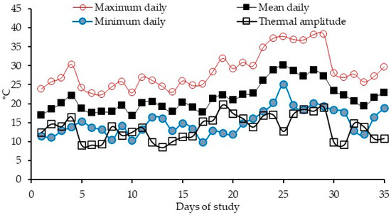 Daily thermal amplitude (calculated as the difference between maximum and minimum temperatures) and maximum, minimum, and mean temperatures during the study period.