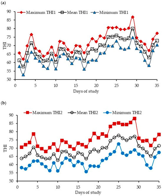 Daily maximum, mean, and minimum thermal humidity indices calculated according to (a) Bianca ([34]; THI1) and (b) Yousef ([35]; THI2) during the study period.