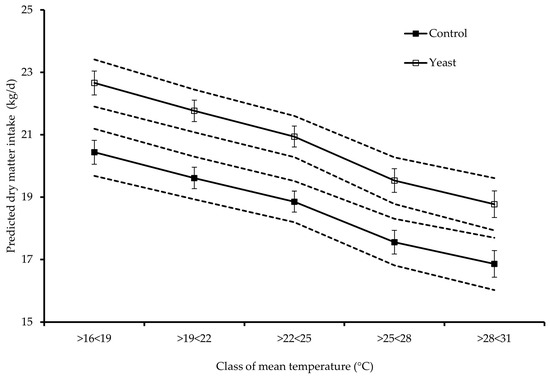 Relationship between classes of mean temperature and predicted dry matter intake (DMI). Dashed lines: upper and lower 95% confidence intervals for the predicted values in each diet. Vertical bars: standard error. Diets are named according to the inclusion of a live yeast culture based on Saccharomyces cerevisae strain 1026, respectively, without for Control or with live yeast supplementation for Yeast.