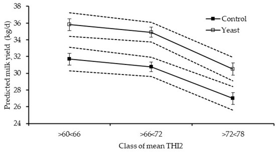 Relationship between classes of mean thermal humidity indices calculated according to ([35]; THI2) and predicted milk yield. Dashed lines: upper and lower 95% confidence intervals for the predicted values in each diet. Vertical bars: standard error. Diets are named according to the inclusion of a live yeast culture based on Saccharomyces cerevisae strain 1026, respectively, without for Control or with live yeast supplementation for Yeast.