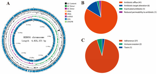 To achieve a comprehensive understanding of the genetic makeup of the HZDC01 strain, it underwent WGS using the Illumina NovaSeq platform and third-generation sequencing technologies. The sequencing process achieved a coverage of 206×, producing 6,851,204 high-quality reads, with 99.02% of them classified as high-quality, accurately reflecting the actual nucleotide composition of the strain. A total sequence length of 1,029,659,932 bp and a GC content of 50.8% were obtained on the ONT platform. The complete genome of the HZDC01 strain comprises one circular chromosome and three circular plasmids. The chromosome itself is 4,835,271 bp in size, with a GC content of 50.71%, and contains 4505 open reading frames (ORFs), 22 rRNA genes (including 8 5S rRNAs, 7 16S rRNAs, and 7 23S rRNAs), and 86 tRNA genes (Figure 2A). The analysis of ARGs in the chromosome revealed diverse mechanisms of resistance (Figure 2B). Specifically, the prediction results identified 41 genes associated with antibiotic efflux, six genes linked to alterations in antibiotic targets, one gene related to antibiotic inactivation, and one gene contributing to reduced antibiotic permeability (Table S1). Additionally, 40 VFs were detected, including 37 factors related to adherence, two associated with immune evasion, and one toxin (Figure 2C).