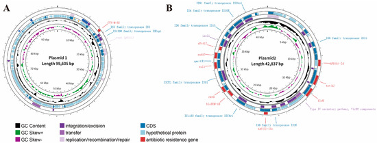- Grant, J.R.; Enns, E.; Marinier, E.; Mandal, A.; Herman, E.K.; Chen, C.Y.; Graham, M.; Van Domselaar, G.; Stothard, P. Proksee: In-depth characterization and visualization of bacterial genomes. Nucleic Acids Res. 2023, 51, W484–W492. [Google Scholar] [CrossRef]