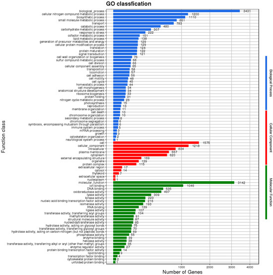 The genomic sequence of HZDC01 was comprehensively annotated, as depicted in Figure 4. A total of 3431 coding sequences were annotated, assigned to 83 distinct Clusters of Orthologous Groups (COG) categories. These categories were further divided into three primary functional groups. The Biological Process group accounted for 51.81% of the annotated sequences, reflecting their direct involvement in dynamic biological activities. The Cellular Component group represented 15.66% of the annotations, indicating their essential roles in cellular architecture and intracellular processes. The Molecular Function group comprised 32.53% of the annotated genes, representing molecular-level activities within the cell.