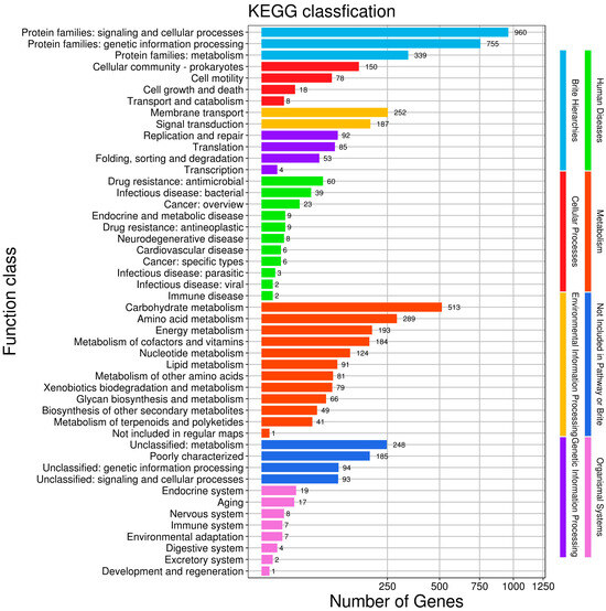 To enhance our understanding of gene functions in HZDC01, a comprehensive analysis was conducted by mapping 4924 putative proteins to their orthologs in the KEGG database, as illustrated in Figure 5. These proteins were categorized into six main functional groups: (1) Cellular Processes: 254 proteins, focusing on fundamental cellular mechanisms. (2) Environmental Information Processing: 439 proteins, involved in the processing of environmental signals and responses. (3) Genetic Information Processing: 234 proteins, dealing with the mechanisms of genetics such as replication, transcription, and translation. (4) Human Diseases: 167 proteins, linked directly to pathogenicity and interactions with human hosts. (5) Metabolism: 1711 proteins, encompassing a broad range of metabolic pathways that support bacterial survival and growth. (6) Organismal Systems: 65 proteins, which play roles in the system-level operations of the organism.