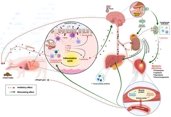 Representation of interactions between the immune response, neuroendocrine axis, and metabolism during a sanitary challenge with an enteric pathogen in pigs. The figure illustrates the systemic effects of an enteric infection in pigs, highlighting the immune, endocrine, and metabolic responses, as well as their complex interactions and consequences on feed intake and growth. The entry of an enteric pathogen (such as Salmonella or E. coli) activates immune-competent cells in the intestinal mucosa, leading to the production of reactive oxygen species (ROS) and increased intestinal permeability. This process induces the release of pro-inflammatory cytokines (TNF-α, IL-1β, IL-6), triggering the local inflammation cycle. The elevation (↑) of cytokines promotes the proliferation of immune cells and amplifies the inflammatory cycle. Pro-inflammatory cytokines reach the central nervous system and activate the hypothalamic–pituitary–adrenal (HPA) axis. The hypothalamus releases corticotropin-releasing hormone (CRH), which stimulates the anterior pituitary to secrete adrenocorticotropic hormone (ACTH), ultimately activating the adrenal glands. The adrenal cortex releases glucocorticoids (which modulate inflammation and promote metabolic adjustments during immune challenge), while the adrenal medulla secretes catecholamines (which rapidly mobilize energy substrates). In addition to stimulating lymphocyte activation (T and B cells), the HPA axis also contributes to fever development, which is triggered when pro-inflammatory cytokines stimulate the hypothalamus to produce prostaglandin E2 (PGE2). To meet the high energy demand imposed by inflammation, several metabolic pathways are activated, including proteolysis (↑ muscle protein degradation), lipolysis (↑ fat mobilization), glycolysis, and gluconeogenesis (↑ glucose availability). These alterations result in increased amino acid release, which is redirected toward glucose synthesis, acute-phase protein (APP) production, and inflammatory mediator synthesis. The liver responds to inflammation by increasing the production of APP, which supports immune modulation, nutrient transport, and host defense. Altogether, the activation of these systems leads to reduced (↓) feed intake and ↓ weight gain, as physiological priorities shift toward immune defense and the maintenance of body homeostasis.