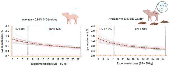 Moreover, individual pigs’ nutrient requirements, particularly AA, vary over time and can be influenced by several factors that contribute to differences in individual responses [130]. One such factor is exposure to environmental stressors [4,132], as individuals within a population may respond differently to environmental stimuli. Challenging sanitary conditions can impair intestinal AA absorption, increase endogenous protein losses in the gut, and promote AA oxidation to support immune response [4]. These physiological changes reduce growth performance and alter AA requirements. Specifically, SC not only impairs performance but also increases variability among pigs in terms of growth, body composition, and Lys requirements (Figure 3, [133]).