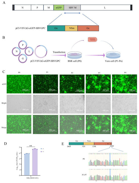 The plasmid pCI-VSVΔG-eGFP-SBVGPC was co-transfected with the helper plasmids pCI-VSV-N, -P, -L, and -G into BSR cells. When more than 90% of the cells displayed green fluorescence, the supernatant (P0) was collected and passed into Vero cells for amplification. During subsequent passages, enhanced fluorescence and more pronounced cytopathic effects (CPE) were observed, indicating the successful rescue and stable propagation of the recombinant virus (Figure 1C).