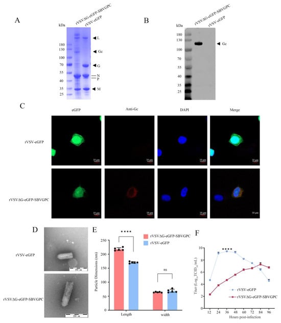 Characterization of rVSVΔG-eGFP-SBVGPC. (A) SDS-PAGE analysis of purified rVSVΔG-eGFP-SBVGPC (Lane 1) and rVSV-eGFP (Lane 2) virions stained with Coomassie blue. Positions of viral proteins, including Gc, are indicated on the right. (B) Western blot analysis of purified virions. rVSVΔG-eGFP-SBVGPC virions reacted specifically with mouse anti-Gc protein serum (Lane 1), while no reactivity was observed for rVSV-eGFP virions (Lane 2). (C) Immunofluorescence analysis showing expression of SBV Gc protein in Vero cells infected with rVSVΔG-eGFP-SBVGPC. Cells were stained with mouse anti-Gc protein serum followed by Alexa-Fluor 594-labeled secondary antibody. Red fluorescence indicates Gc expression. No red fluorescence was observed in cells infected with rVSV-eGFP. Scale bar = 10 μm. (D) Transmission electron micrographs of purified virions stained with 2% phosphotungstic acid (PTA). rVSVΔG-eGFP-SBVGPC virions displayed surface spikes, consistent with incorporation of SBV glycoproteins. (E) Measurements of viral particle dimensions based on electron micrographs. Length of rVSVΔG-eGFP-SBVGPC particles was significantly greater than that of rVSV-eGFP particles, while no significant difference in particle width was observed. Data are presented as mean ± standard deviation (n = 5). ****, p < 0.0001. (F) Growth kinetics of rVSVΔG-eGFP-SBVGPC and rVSV-eGFP in Vero cells. Viral titers (TCID50/mL) were measured at various time points post-infection. ****, p < 0.0001.