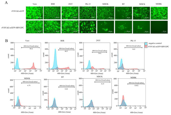 Vero cells from monkey origin, HEK293T cells from human origin, BSR cells from Syrian hamster origin, PK-15 cells from pig origin, MDCK cells from dog origin, MDBK cells from bovine origin, MDOK cells from goat origin, and BT cells from bovine origin were infected with rVSVΔG-eGFP-SBVGPC at an MOI of 0.1. Fluorescence was observed at 36 h post-infection using the AMG EVOS FL microscope. Subsequently, the cells were fixed with 4% paraformaldehyde (PFA) (Beyotime, Zhangjiang Hi-Tech Park, Pudong New Area, Shanghai, China), resuspended in PBS, and analyzed using the Apogee A60-Universal for flow cytometry (Apogee Flow Systems, Hemel Hempstead, Hertfordshire, United Kingdom). To ensure the accuracy of flow cytometry analysis, a stepwise gating strategy was employed. First, cell populations were refined based on 488-SALS (Peak) and 488-LALS (Peak), which reflect the forward and side scatter characteristics of cells, respectively. This step excluded cellular debris and non-target cells, thereby enriching for cells with the appropriate size and granularity. Next, singlet cells were identified by plotting a scatter plot of 488-SALS (Peak) versus 488-SALS (Area), allowing for the exclusion of doublets and cell aggregates. Finally, within the gated singlet population, green fluorescence signals in the 488-Grn (Peak) channel were analyzed. Histograms of fluorescence intensity versus event count were generated to assess the proportion and distribution of GFP-positive cells. The threshold for GFP positivity was determined based on uninfected negative control samples. This gating strategy (Supplementary Figure S1A) was consistently applied across all experimental groups to ensure data comparability and consistency.