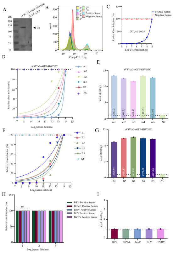 VNT using rVSVΔG-eGFP-SBVGPC to detect SBV neutralizing antibodies. (A) Western blot analysis of purified rVSVΔG-eGFP-SBVGPC (Lane 1) and purified rVSV-eGFP (Lane 2) using SBV-positive serum. (B,C) Serum neutralizing antibody titers against rVSVΔG-eGFP-SBVGPC were determined using a virus neutralization test (VNT). SBV-positive serum was serially diluted and mixed with rVSVΔG-eGFP-SBVGPC, followed by incubation to ensure complete neutralization. The mixture was then added to Vero cells in a 96-well plate for further incubation. GFP expression in the cells was detected using a multiparameter flow cytometer (Apogee) to assess viral infection (B), and the relative virus infection rate was calculated using negative serum as the baseline (C). The neutralizing antibody titer (NT50) was defined as the highest serum dilution that completely inhibited GFP expression in 50% of the wells, and was calculated using the Reed–Muench method. (D) Flow cytometry was used to analyze the inhibition of rVSVΔG-eGFP-SBVGPC infection by polyclonal antisera against SBV Gc obtained from immunized mice (m1–m5), with fetal bovine serum (FBS) as the negative control. (E) Neutralizing antibody titers of mouse sera (m1–m5) shown in panel D were quantified based on flow cytometry. (F) Flow cytometry was used to analyze the inhibition of rVSVΔG-eGFP-SBVGPC infection by polyclonal antisera against SBV Gc obtained from immunized cattle (B1–B5), with FBS as negative control. (G) Neutralizing antibody titers of cattle sera (B1–B5) shown in panel F were quantified using flow cytometry. (H) Flow cytometry was used to analyze the inhibitory effects of bovine virus-specific sera (BRV, BHV-1, BCoV, BLV, and BVDV) on rVSVΔG-eGFP-SBVGPC infection, with FBS as the negative control. (I) Neutralizing antibody titers of various heterologous bovine virus-positive sera shown in panel H were quantified based on flow cytometry.