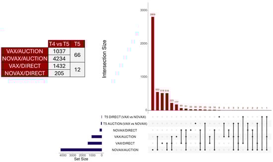 UpSet plot and differential gene expression summary across experimental comparisons of vaccination (VAX) versus sham controls (NOVAX) with respect to marketing strategy (AUCTION and DIRECT). Horizontal bars on the left represent the total number of genes identified in each individual set. Vertical bars on the top of the matrix indicate the size of each intersection between selected sets, with connected dots below each bar showing which sets are involved in that intersection.