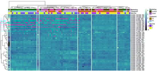 Hierarchical clustering heatmap of gene expression across timepoints, marketing, and vaccine statuses. Gene clusters (rows) and samples (columns) were hierarchically clustered based on z-score normalized gene expression values. Color annotations above the heatmap denote metadata categories: marketing (AUCTION: green, DIRECT: pink), time point (T4: orange, T5: turquoise), and vaccine status (VAX: yellow, NOVAX: purple). Expression intensity is color-coded (white/light blue = high, black/dark blue = low). Clusters are annotated with size labels indicating the number of genes per k-means cluster (n = 48).