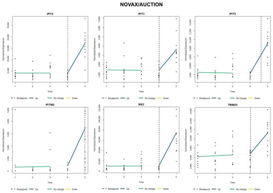 Time-course expression of type I interferon-stimulated genes (ISGs) following NOVAX/AUCTION treatment. Normalized expression levels of selected ISGs (IFIT2, IFIT3, IFIT5, IFITM2, MX2, and TRIM25) are shown across all five time points (T1–T5). Each panel represents one gene, with relative sample expression values plotted as black dots along the y-axis. Colored lines indicate estimated trends over time: blue for significant upregulation, yellow for significant downregulation, green for no significant change, and white for the estimated trend within that segment prior to the breakpoint. Vertical dashed lines represent the estimated breakpoint, suggesting a critical shift in gene expression levels.
