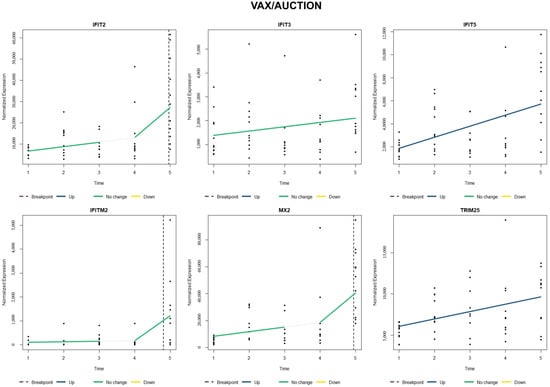 Dynamic trend-wise gene expression was identified for NOVAX/AUCTION (n = 1552), VAX/AUCTION (n = 3600), NOVAX/DIRECT (n = 2037), and VAX/DIRECT (n = 2879) groups across T1–T5 (Supplemental File S4). Of particular interest, genes were considered dynamically expressed with at least one statistically significant segment slope (adjusted p-value < 0.10) for the NOVAX/AUCTION (n = 764), VAX/AUCTION (n = 2513), NOVAX/DIRECT (n = 625), and VAX/DIRECT (n = 1415) groups. Notably, several immune-related genes were identified that corresponded to significant functional enrichments in the previous analyses, specifically involving inflammatory resolution responses and lipid metabolism, cytokine production, and antiviral activity, such as ALOX15, ALOX5, CATHL1, CD14/68/163, CFB, COL1A1/2, GPR4, GPX4, HERC4/5/6, HPGD, IFI6, IFIH1, IFIT2/3/5, IFITM2/3/5, IL1B/1R2/1RAP/1RN/12B/13RA1/16/17D/18RAP/21R, ISG15, LIF, LRP1, MX2, S100A9/12, TNF, and TRIM25.