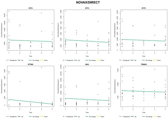 Time-course expression of type I interferon-stimulated genes (ISGs) following NOVAX/DIRECT treatment. Normalized expression levels of selected ISGs (IFIT2, IFIT3, IFIT5, IFITM2, MX2, and TRIM25) are shown across all five time points (T1–T5). Each panel represents one gene, with relative sample expression values plotted as black dots along the y-axis. Colored lines indicate estimated trends over time: blue for significant upregulation, yellow for significant downregulation, green for no significant change, and white for the estimated trend within that segment prior to the breakpoint. Vertical dashed lines represent the estimated breakpoint, suggesting a critical shift in gene expression levels.