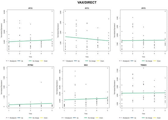 Time-course expression of type I interferon-stimulated genes (ISGs) following VAX/DIRECT treatment. Normalized expression levels of selected ISGs (IFIT2, IFIT3, IFIT5, IFITM2, MX2, and TRIM25) are shown across all five time points (T1–T5). Each panel represents one gene, with relative sample expression values plotted as black dots along the y-axis. Colored lines indicate estimated trends over time: blue for significant upregulation, yellow for significant downregulation, green for no significant change, and white for the estimated trend within that segment prior to the breakpoint. Vertical dashed lines represent the estimated breakpoint, suggesting a critical shift in gene expression levels.