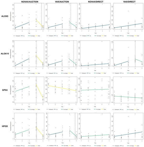 Time-course expression of specialized pro-resolving mediator (SPM)-related genes across all treatment conditions. Normalized expression levels of ALOX5, ALOX15, GPX4, and HPGD are displayed across four treatment conditions: NOVAX/AUCTION, VAX/AUCTION, NOVAX/DIRECT, and VAX/DIRECT. Each panel represents one gene-treatment combination, with expression measured over all five time points (T1-T5). Individual sample values are shown as black dots along the y-axis. Trend lines indicate directional changes: blue for significant upregulation, yellow for significant downregulation, green for no significant change, and white for the estimated trend within that segment prior to the breakpoint. Vertical dashed lines represent the estimated breakpoint, suggesting a critical shift in gene expression levels.