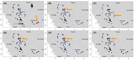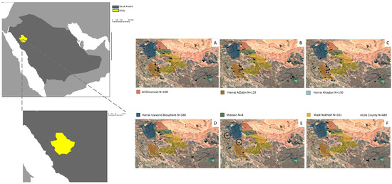 Geographic location of AlUla County within Saudi Arabia. Sampling locations, each sample location corresponds to an area of ~2.5 km2 (A). The average number of camels sampled per location is 5, with a range from 1 to 20. (B) The average number of goats sampled per location is 7, with a range from 1 to 17. (C) The average number of sheep sampled per location is 6, with a range from 1 to 20. (D) The average number of cattle sampled per location is 5, with a range from 2 to 10. (E) The number of donkeys sampled per location is 2, except in the circled locations where the number of sampled animals was 51. (F) Each sample location corresponds to an area of ~3 km2; the average number of Rodents sampled per location is 10, with a range from 1 to 25. Details of the sample size for each species within each reserve are provided in Supplementary Table S3.