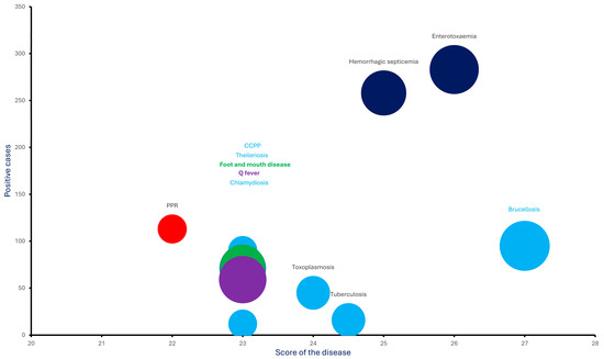 Scatter plot illustrating the distribution of positive disease cases. The x-axis represents the prioritization score assigned to each disease, the y-axis shows the number of positive cases detected, and the bubble size indicates the total number of samples tested for each respective disease. Representative colors displaying different diseases, i.e., Red: PPR; Blue: CCPP, Theileriosis, Chlamydiosis, Toxoplasmosis, Tuberculosis, Brucellosis; Dark Blue: HS, Enterotoxaemia; Green, FMD; Purple: Q fever.