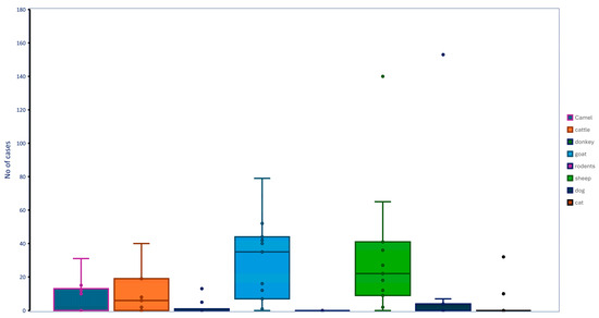 Box-Whisker plot presentation of positive cases of prioritized infectious diseases across different animal species. Each color represents a distinct animal species, e.g., camel: blue; cattle: brown; donkey: green; goat: blue; rodents: magenta; sheep: olive green; gray: dogs; mocha: cats, while dots within the boxes indicate individual data points. Outliers are marked as points beyond the whiskers.