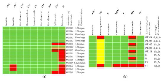 2.2. Antimicrobial Susceptibility Testing (AST) and Antibiotic Resistance Profiles of Salmonella spp. and L. monocytogenes Strains
