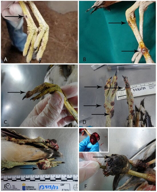 Gross cutaneous manifestations of Avipoxvirus infection in the Stone-curlews included in this study, presented in increasing severity from mild to severe. (A). Case 3. Mild. Small vesicular lesion on the tarsometatarsus (arrow). (B). Case 2. Mild. Multiple pink ulcerative and vesicular lesions on the tarsometatarsus, treated with iodine at the WRCT (arrows). (C) Case 6. Moderate. One vesicular lesion on the phalanges (arrow). (D). Case 5. Severe. Multiple red nodular lesions on the leg tarsometatarsus and phalanges (arrows). (E). Case 4. Severe. Multiple red eroded nodules on the tarsometatarsus and phalanges (arrows). (F). Case 7. Severe. A large, ulcerated nodule occupying nearly the entire phalangeal surface (arrow).