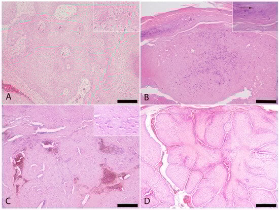 Histopathological examination of six of the eight cases from our study showed focal to multifocal epidermal thickening due to keratinocyte hyperplasia, particularly within the stratum spinosum, the presence of characteristic eosinophilic intracytoplasmic inclusion bodies (Bollinger bodies) in the infected keratinocytes (solid or ring-shaped), and variable degrees of epidermal necrosis (Figure 2B and Figure 3). Additional histopathological findings included heterophilic inflammatory infiltrates in five of six cases (83.3%), ballooning degeneration in five of six (83.3%), hemorrhage in four of six (66.7%), erosion in four of six (66.7%), and ulceration in four of six (66.7%) (Figure 3). Keratin pearls were identified exclusively in two cases (Case 2 and Case 4) (Figure 3). Histopathological evaluation could not be performed for Cases 3 and 8 due to the unavailability of biopsy material.