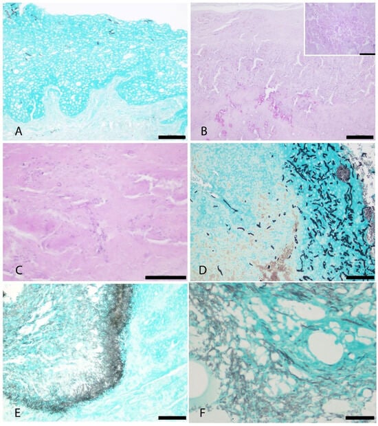 Histopathological findings of secondary fungal co-infections. (A). Case 1. Fungal hyphae were observed in the superficial stratum of the epidermis, without associated histopathological alterations. GMS stain (Bar = 100 µm). (B). Case 6. Fungal hyphae are present in middle layers of the hyperplastic epidermis, accompanied by necrosis and inflammation. PAS stain (Bar = 100 µm). Inset: higher magnification of the intralesional hyphae. PAS stain (Bar = 50 µm). (C). Case 4. Branched, parallel, dichotomous hyphae, consistent with Aspergillus fumigatus, are embedded within a necrotic and inflamed area of the hyperplastic epidermis. PAS stain (Bar = 50 µm). (D). Case 2. Infiltrating and invasive fungal hyphae were observed within the proliferative epithelium. GMS stain (Bar = 50 µm). (E). Case 7, skin. Short, thin septate fungal hyphae stained black, with angular and dichotomous branching, suggestive of Aspergillus sp. (Bar = 50 µm). (F). Case 7, lung. Similar fungal hyphae observed, consistent with Aspergillus infection, confirmed by PCR as A. fumigatus (Bar = 50 µm).