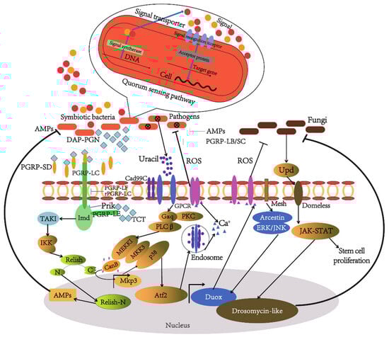 Illustrates multiple immune signalling pathways within the insect gut, including the IMD pathway, Toll pathway, and JAK-STAT pathway. These pathways are activated through various pattern recognition ‘receptors (such as PGRP-LC), ultimately inducing the production of antimicrobial peptides (AMPs) to defend against pathogen invasion. Furthermore, the figure depicts the generation of reactive oxygen species (ROS) and their pivotal role in host defence. The upper portion of the diagram elucidates the mechanisms by which symbionts, pathogens, and their interactions influence the host immune response, including microbial community interactions regulated by quorum-sensing signals.