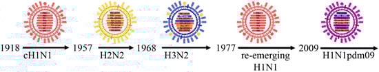IAVs evolve very rapidly due to antigenic drift and antigenic shift. Antigenic drift, which is responsible for human seasonal influenza viruses, occurs through the gradual accumulation of mutations in the HA and NA surface proteins, leading to antigenic changes in IAVs. Antigenic shift, or reassortment, occurs due to the segmented nature of the IAVs genome. When a host is simultaneously infected with two genetically different IAVs, an exchange of genetic material occurs, what can contribute to the emergence of different recombinant viruses. The accumulation of mutations during replication leads to amino acid replacement that can affect preexisting immunity, host range, virulence, and other factors []. Sustained human-to-human transmission of a virus to which a significant part of the population lacks immunity can lead to a pandemic, where large numbers of human cases occur simultaneously on a community-wide scale [,,]. Examples of antigenic shift include the occurrence of five influenza pandemics in human history: the Spanish flu A(H1N1) of 1918, the Asian flu A(H2N2) of 1957, the Hong Kong flu A(H3N2) of 1968, the Russian flu A(H1N1) of 1977, and the pandemic A(H1N1) of 2009 [,] (Figure 3).