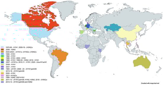 Map of sporadic cases of interspecies transmission of influenza A viruses from pigs to humans. The world map was created online at https://mapchart.net (accessed on 21 August 2025).