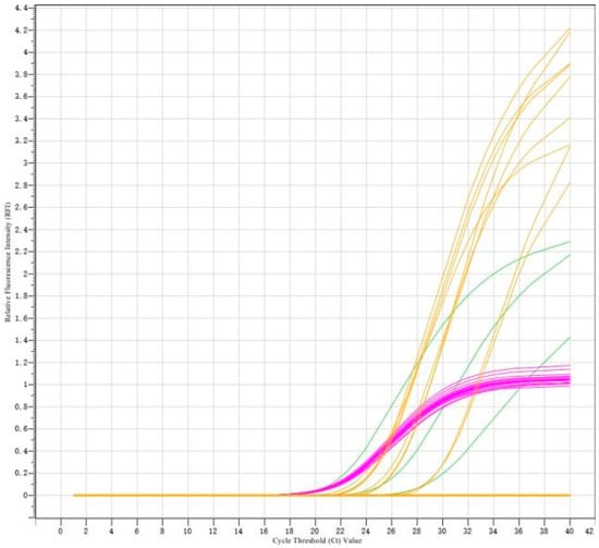 Amplification curves of the duplex real-time RT-PCR for simultaneous detection of PRRSV-1 and PRRSV-2. Curves represent fluorescence signals from orange: PRRSV-2 (North American genotype), positive control (PC); green: PRRSV-1 (European genotype), PC; and purple: internal control (IC).