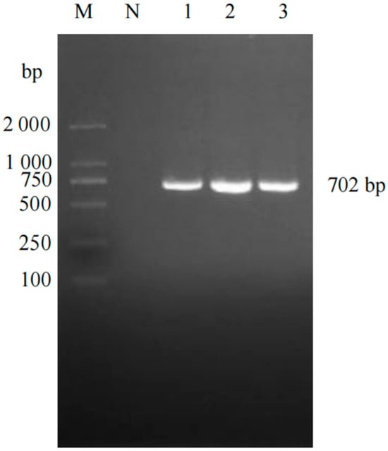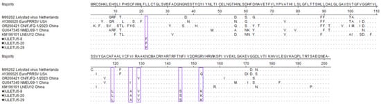 PRRSV belongs to the order Nidovirales, family Arteriviridae, and genus Arterivirus. Its genome is a non-segmented, single-stranded positive-sense RNA, approximately 15.4 kb in length, containing at least 12 open reading frames (ORFs) that encode eight structural proteins and at least 16 non-structural proteins []. From the 5′ end to the 3′ end, the genome is composed of ORF1a, ORF1b, ORF2a, ORF2b, ORF3, ORF4, ORF5a, ORF5, ORF6, and ORF7. Among them, ORF1a and ORF1b, located at the 5′ end, account for approximately 80% of the total genome length and are responsible for encoding replication enzyme proteins with RNA polymerase activity []. ORF5 encodes the envelope glycoprotein (GP5) of the virus, ORF6 encodes the membrane protein (M), and ORF7 encodes the nucleocapsid protein (N). GP5 and M are the main targets for antigenic epitope research [,,]. Notably, ORF5 is commonly used for PRRSV genotyping, genetic variation analysis, and evolutionary studies [].