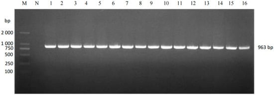 PCR results of selected PRRSV-2-positive samples. M: DL2000 Marker; NC: Negative control; Lanes 1–16: Positive samples.