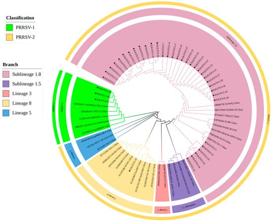 Phylogenetic tree constructed based on the nucleotide sequences of the Open Reading Frame 5 (ORF5) gene from PRRSV strains and reference strains. Phylogenetic analysis was performed using the Neighbor-Joining (NJ) method in MEGA 12 software, with 1000 bootstrap replicates to assess node support values. The pentagram symbols represent the PRRSV strains obtained in this study, while the others are reference strains retrieved from the GenBank database. The final tree was visually optimized using the iTOL online tool to improve readability and identification efficiency.