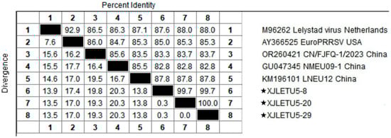 In this study, the PRRSV ORF5 gene sequence (XJLETU5-1-38) and the generated whole genome sequence (XJLETUQ2025-7) have been stored in the GenBank public database. The accession numbers for the 38 ORF5 gene sequences are PX123067-PX123104, and the accession number for the whole genome sequence is PX123105.