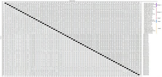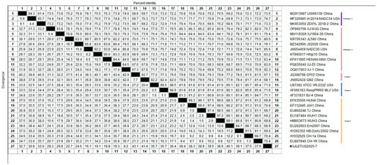 The nucleic acid from samples identified as positive in the previous detection step was reverse transcribed into cDNA using the EasyScript® One-Step gDNA Removal and cDNA Synthesis SuperMix (TransGen Biotech, Beijing, China). To analyze the PRRSV ORF5 gene sequence, specific primers were designed for PRRSV-1 and PRRSV-2: primers for PRRSV-1 were designed according to reference [], while primers for PRRSV-2 were designed based on reference sequences from GenBank. Both designed primer pairs amplified fragments containing the complete ORF5 gene (Table 1) using a high-fidelity DNA polymerase, yielding products of 702 bp for PRRSV-1 and 963 bp for PRRSV-2. Amplification was performed in a Bio-Rad T100 Thermal Cycler (Bio-Rad, USA). The 50 μL PCR reaction mixture contained 25 μL of 2× TransStart® FastPfu Fly PCR SuperMix (TransGen Biotech, Beijing, China), 1 μL each of forward and reverse primers, 2 μL of cDNA template, and 21 μL of ddH2O. The PCR parameters for PRRSV-1 were as follows: initial denaturation at 98 °C for 1 min; 35 cycles of denaturation at 98 °C for 10 s, annealing at 52 °C for 5 s, and extension at 72 °C for 4 s; followed by a final extension at 72 °C for 1 min. The PCR parameters for PRRSV-2 were as follows: initial denaturation at 98 °C for 1 min; 35 cycles of denaturation at 98 °C for 10 s, annealing at 57 °C for 5 s, and extension at 72 °C for 5 s; followed by a final extension at 72 °C for 1 min. Positive PCR products were purified using the TIANgel Midi Purification Kit (TIANGEN, Beijing, China), and subsequently cloned into the pEASY®-Blunt Zero Cloning Vector using the pEASY®-Blunt Zero Cloning Kit (TransGen Biotech, Beijing, China). Positive recombinant plasmids were submitted to Sangon Biotech (Shanghai, China) for sequencing, with all sequencing reactions performed in triplicate.