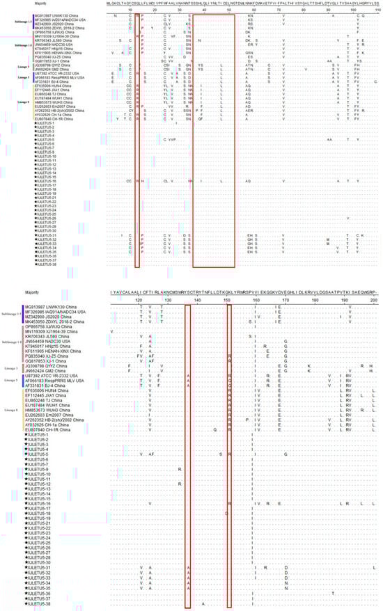 Sequence alignment of the GP5 protein of PRRSV-2 strains (ORF5 encoding 200 aa) revealed (Figure 10) that multiple mutation sites were present in the GP5 protein of 35 strains from southern Xinjiang. In this experiment, one strain exhibited a Q13R mutation, belonging to Lineage 8 (CH-1a and JXA1-like). Two strains showed a K151R mutation, one belonging to Sublineage 1.8 (NADC30-like) and the other to Lineage 8 (CH-1a and JXA1-like). When the 13th amino acid of GP5 mutates from glutamine to arginine or the 151st amino acid mutates from lysine to arginine, the strain exhibits virulent characteristics [,,,]. Mutations in the neutralizing epitope region encoded by ORF5, spanning amino acids 36–52, may lead to the virus evading the neutralizing effect induced by vaccine immunity, thereby reducing the protective efficacy of vaccine immunization. In this study, one strain exhibited a mutation in the neutralizing epitope region, belonging to Lineage 8 (CH-1a and JXA1-like). The 137th amino acid (A137) of GP5 is unique to vaccine strains and is often considered a site for distinguishing wild-type strains from vaccine strains [,,,]. In this study, five NADC30-like isolated strains were found to exhibit A137, which may have resulted from recombination or mutation.