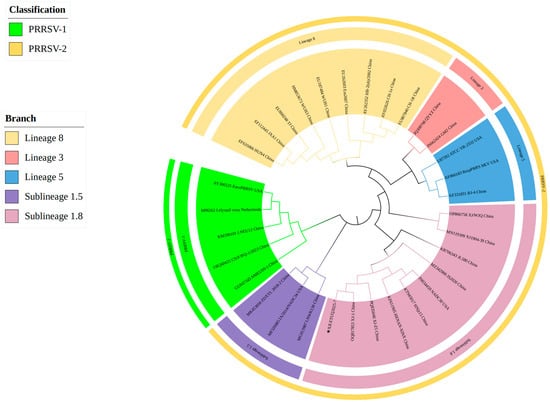 - Li, J.; Gong, W.; Mao, L.; Pan, X.; Wu, Q.; Guo, Y.; Jiang, J.; Tang, H.; Zhao, Y.; Cheng, L. Molecular epizootiology of porcine reproductive and respiratory syndrome virus in the Xinjiang Uygur Autonomous Region of China. Front. Microbiol. 2024, 15, 1419499. [Google Scholar] [CrossRef] [PubMed]