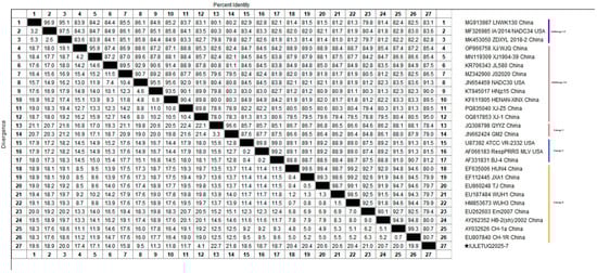 A full-length genomic sequence (15,044 bp) of PRRSV was successfully assembled from samples collected in southern Xinjiang, designated as XJLETUQ2025-7, with an average sequencing depth > 100× and genome coverage > 99.99%. Phylogenetic analysis (Figure 11) revealed that this strain belongs to PRRSV-2 Sublineage 1.8 (NADC30-like). It exhibited nucleotide sequence identities of 78.4–95% and amino acid sequence identities of 67.1–92.3% when compared with 26 reference strains of PRRSV-2. The highest homology was observed with the locally isolated Xinjiang strain XJ-1 (NADC30-like), with nucleotide and amino acid identities reaching 95% and 92.3%, respectively. Together, they form a distinct regional evolutionary cluster (Figure 12 and Figure 13).