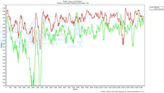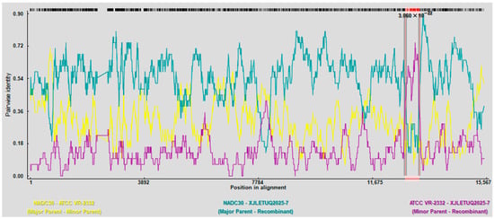 Recombination signals in XJLEYUQ2025-7 were scanned using the RDP4 software (employing seven algorithms: RDP, GeneConv, BootScan, MaxChi, Chimera, SiScan, and 3Seq). All methods consistently confirmed major parent strain: NADC30; minor parent strain: ATCC VR-2332 (Figure 14). Recombination breakpoints were further verified using SimPlot 3.5 software, which identified two recombinant regions: 7781–8021 nt (NSP2) and 12,741–13,201 nt (NSP10) (Figure 15).