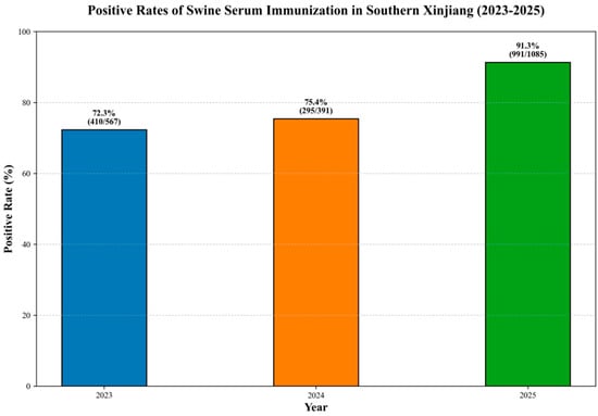 A PRRSV-specific antibody detection assay was performed on 2043 serum samples collected from vaccinated swine across 13 farms in southern Xinjiang between 2023 and 2025. The results revealed an overall antibody positivity rate of 83.0% (1696/2043). Dynamic annual analysis showed that the positivity rate was 72.3% (410/567) in 2023, 75.4% (295/391) in 2024, and increased to 91.3% (991/1085) in 2025 (Figure 16), suggesting a high level of immune protection provided by the PRRSV vaccine in the southern Xinjiang region.