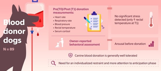 - Ferreira, H.C.M.; Ferreira, R.R.F.; Pinto, S.C.P.; Mesa-Sanchez, I. Prevalence and characteristics of adverse reactions in dogs donating blood. J. Small Anim. Pract. 2025, 66, 556–560. [Google Scholar] [CrossRef]