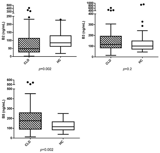 Serum vitamins B2, B3, and B5 (ng/mL) in dogs with chronic liver disease (CLD) and healthy controls (HC). Outliers are shown as black dots.