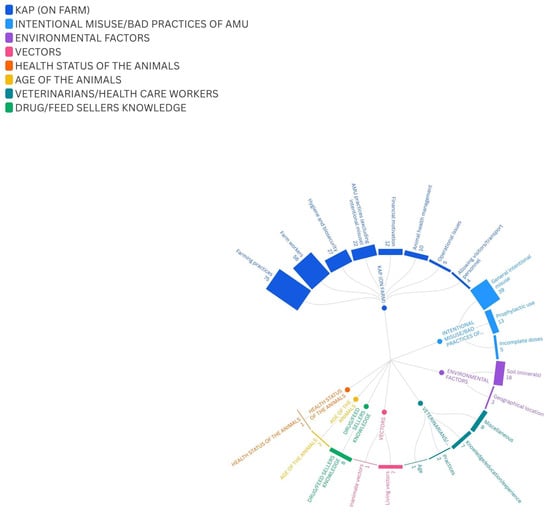 - Mistreatment of illness, misuse [29,86] such as no differentiation between antimicrobials and other type of medicines [84], infrequent use of antibiotics to treat parasites or animals not eating [34], use it as painkillers or for treatment of viral diseases [39], administering antibiotics at the first indication of disease [38], constant use of broad-spectrum antibiotic more frequently [87], or use of human antimicrobials in animal treatment [31];