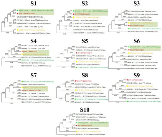 Maximum likelihood phylogenetic trees of the Seg-1(S1)–Seg-10(S10) of BTV and related recombinant strains. The numbers on the branch represent evolutionary distances.