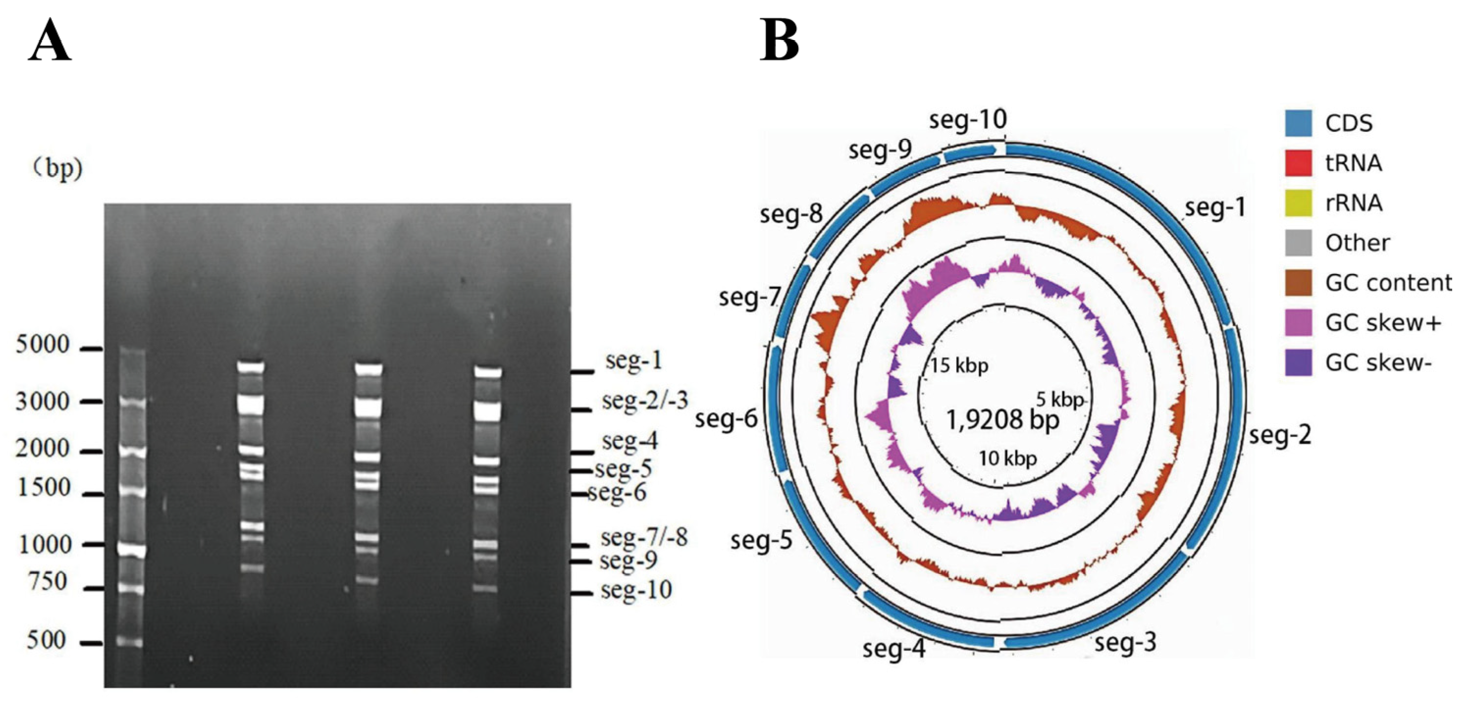 dsRNA genome identification and analysis. (A) Electrophoresis profile of the dsRNAs; (B) genome map. Note: CDS: the cds fragment after assembly sequence annotation; GC content: displays the change in GC content in the assembly sequence (calculated using a sliding window with different lengths according to the sequence length; for contig length < 10,000, the sliding window length is 50, and for contig length < 100,000, the sliding window length is 500); GCskew ±: GC content offset, where GCskew = (G − C)/(G + C), used to measure the relative content of G and C. If G is greater than C, the value of GCskew is positive, and if G is less than C, it is negative.