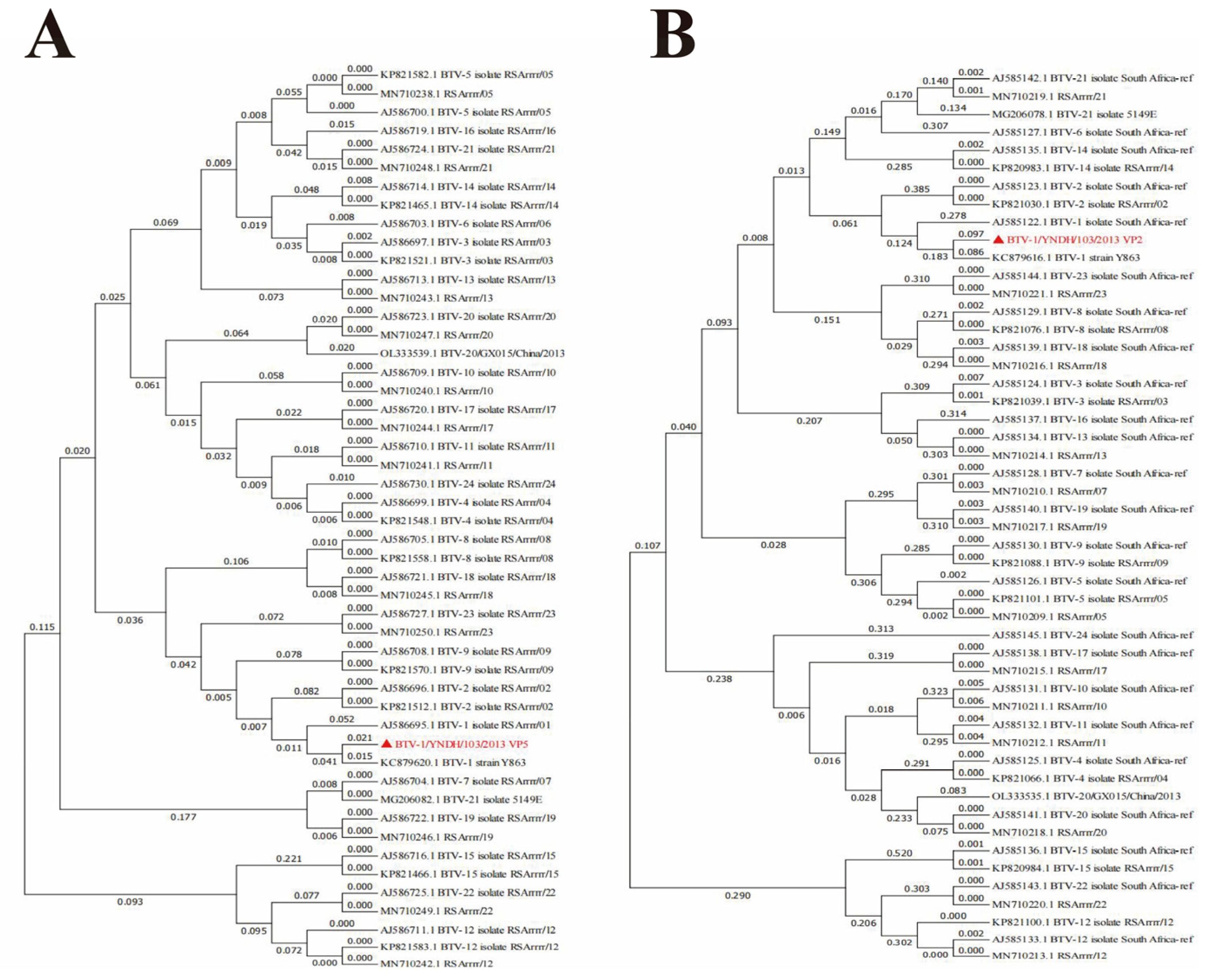 Phylogenetic Analysis of BTV-1/YNDH/103/2013. (A) Analysis of Segment 2 (S2); (B) Analysis of Segment 6 (S6). Phylogenetic trees were constructed using MEGA 7.0. The numbers at each branch indicate branch distances. YNDH/103/2013 is depicted with a red triangle. RSArrrr/01-24 represents the BTV-1–24 serotype reference strains deposited in GenBank.